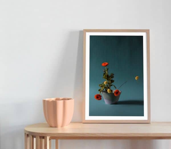 The print was designed with the sophisticated, creative in mind who enjoys colour. The rich colour palette gives the print a sophisticated feel, while the flowers add a touch of softness to the print. Style it in a black or oak frame for a sophisticated look.