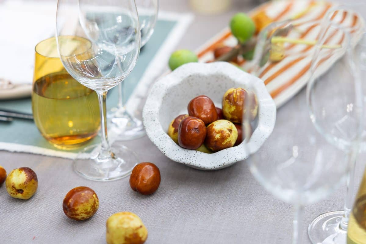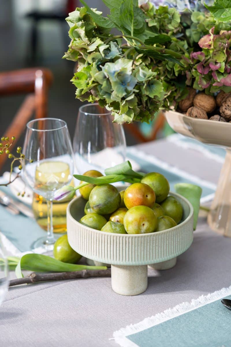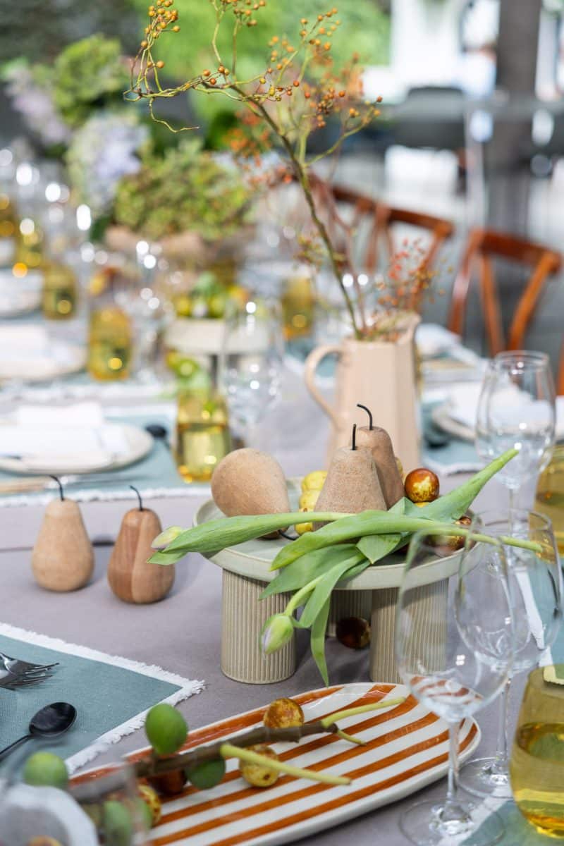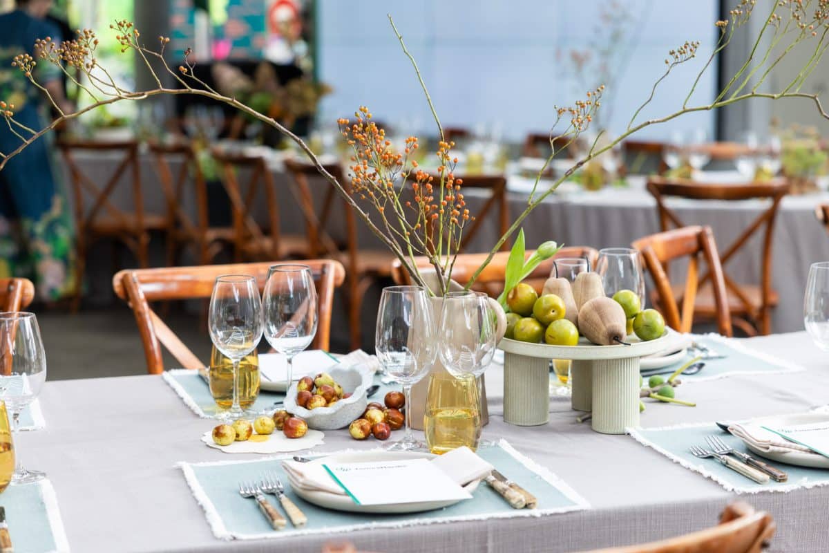For the tablescape we layered warm textures and decorative elements with a modern farmhouse look. The textures included obvious things like meadow flowers in glass jugs, delivering on the modern farmhouse theme. It also included unusual textures like walnuts and plums, styled organically – a signature tablescape styling technique we’ve known for.