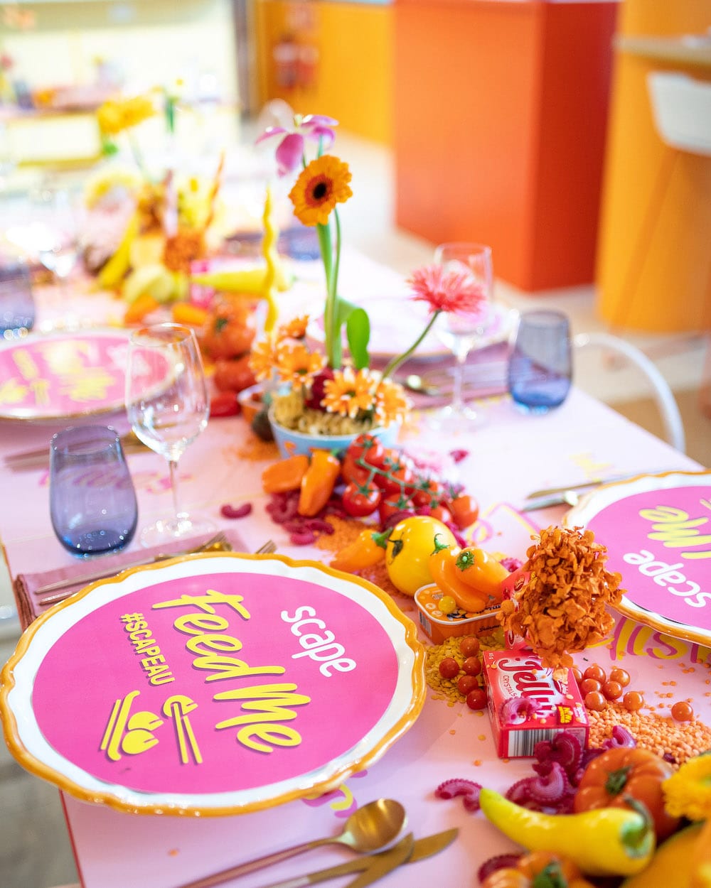 The table featured here was for a foodie event, so we layered the table to be an immersive ‘food’ story. The tablecloth was custom printed with words related to eating, like yummy and tasty.